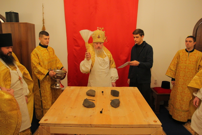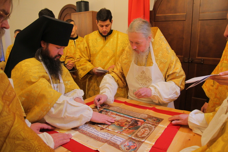 Новый Престол был двукратно омыт  — первый раз теплою водой с мылом, во второй – водой, смешанной с красным вином. Затем было совершено  таинственное помазание Престола святым миром. После помазания Престол был облачен  в верхнюю и нижнюю одежду. На новый Престол были поставлены Евангелие, Крест и дарохранительница. Также был освящен и облачен  Жертвенник.