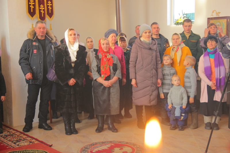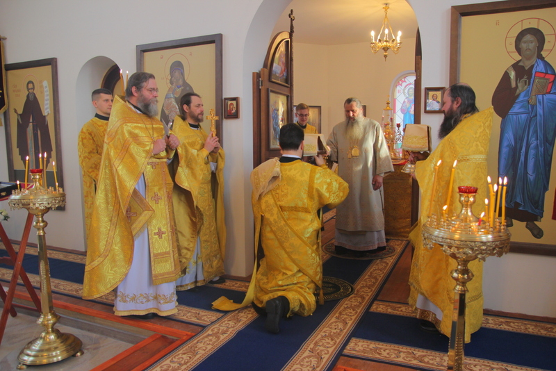 После этого Царские врата ненадолго открылись. Епископ Пантелеимон, преклонив колени, стоя лицом к народу, прочитал особую молитву. В ней звучали прошения к Господу Богу ниспослать Святого Духа и освятить храм и жертвенник сей. Все люди в храме также молились на коленях.