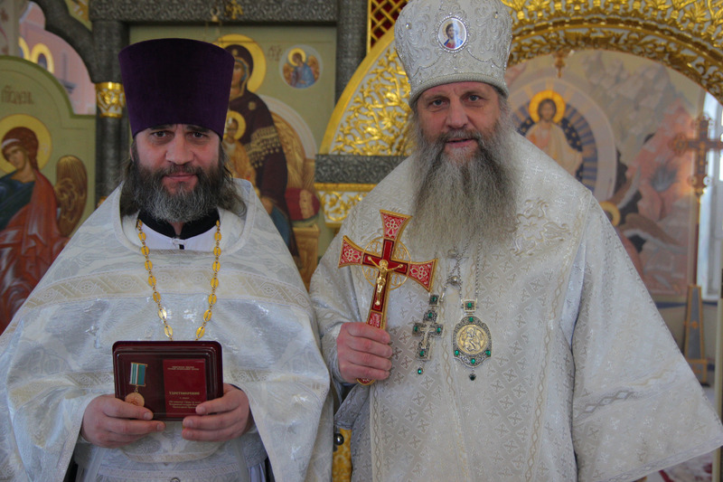 После проповеди митрополит Хабаровский и Приамурский Артемий за усердные труды во Благо Святой Церкви и по случаю 50-летия наградил епархиальной медалью II степени иерея Александра Иванова.