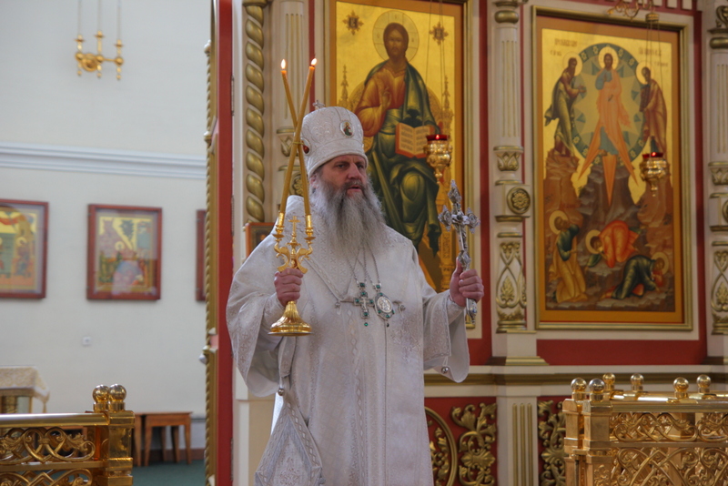 Его Высокопреосвященству сослужили: секретарь епархии иеромонах Николай (Белозеров), настоятель Спасо-Преображенского кафедрального собора протоиерей Георгий Сивков, духовенство собора.